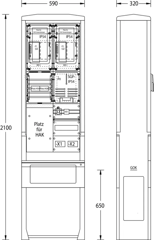 Zähleranschlusssäule ZAS-S-2-SGF Westfalen Weser Netz 2131-1523.45, Säule Größe 0 / A070-2100, Schutzart IP44 / Schutzklasse II, mit Doppelschließung für Profilhalbzylinder 40 oder 45 mm, 1 Platz für Hausanschlusskasten NH00, 2 eHZ-Zählerplätze nach DIN 43870, 450x250mm IP54 mit Klappfenster, 2 integrierte Kontaktiereinheiten (BKE-I), 1 TSG-Platz IP54 nach DIN 43 870, 1 Steuersicherung D01/1 pol. 10 A und Steuerklemme für TSG mit Plombierhaube, 2 Plätze für Hauptsicherungsautomaten auf SS-System 5 pol./12×5 mm Cu., 2 Abgänge mit Hauptleiterabzweigklemme 1,5-25 mm² 5 pol.