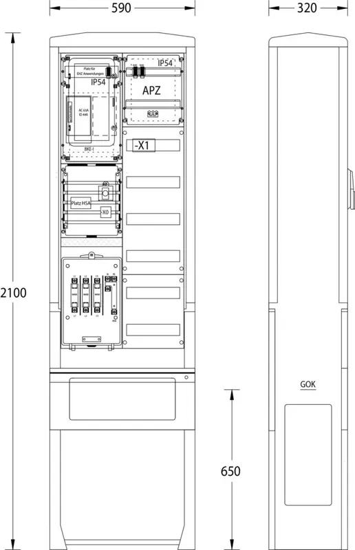 Zähleranschlusssäule ZAS-S-1-1VF-APZ Stromnetz Hamburg 2133-2913.45-1VF, Säule Größe 0/ A070-2100, Schutzart IP44 / Schutzklasse II, mit Doppelschließung für Profilhalbzylinder 40 oder 45 mm, 1 Hausanschlusskasten NH00, 1 eHZ-Zählerplatz nach DIN 43870, 450x250mm, IP54 mit Klappfenster, 1 integrierte Kontaktiereinheit (BKE-I), optische Schnittstelle / RJ45 Buchse, 1 Platz für Hauptsicherungsautomat auf Sammelschienensystem 5pol./12×5 mm Cu., 1 Abgang mit Hauptleiterabzweigklemme 1,5-25 mm² 5 pol., 1 Verteilerfeld mit 7×12 TE