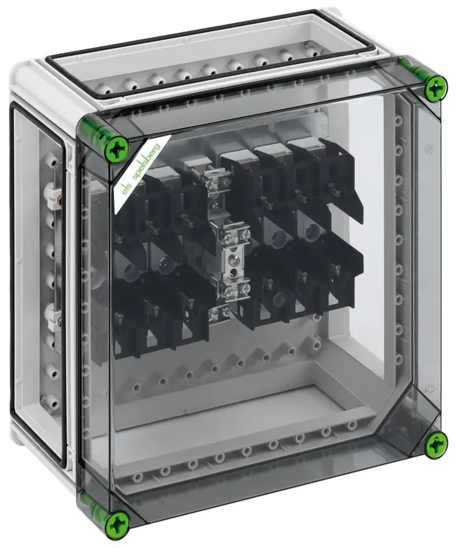 NH-Sicherungsgehäuse, 2 x NH 00-Sicherungsunterteil, Schellenanschluss 1,5-70mm², PE/N-Klemme 2 x 50mm², montiert auf Montageplatte, 3 x Gehäuseverbinder (GGV), mit transparentem DeckelAbmessungen: 320 x 320 x 179mm