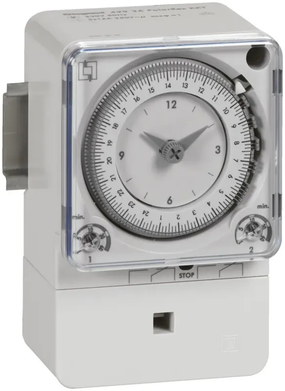 Legrand PolaRex QKKT, analoge Abtauschaltuhr mit Quarzmotor (Ganggenauigkeit +/- 1 Sek/Tag, Gangreserve 100 Std.), 2 Kanal, Betriebsspannung 230 V 50/60 Hz. Schaltuhr mit Tagesscheibe und einstellbaren Kurzzeitprogrammen, Schaltzeit von 1 bis 60 Min. einstellbar. Die kürzeste Schaltfolge (Beginn einer Schaltzeit): 30 Min.. Montage auf Tragschiene EN 60715 oder Aufputz, Abmessung (HxB): 113,7 x 72 mm. Schaltausgang: 2 Wechsler.