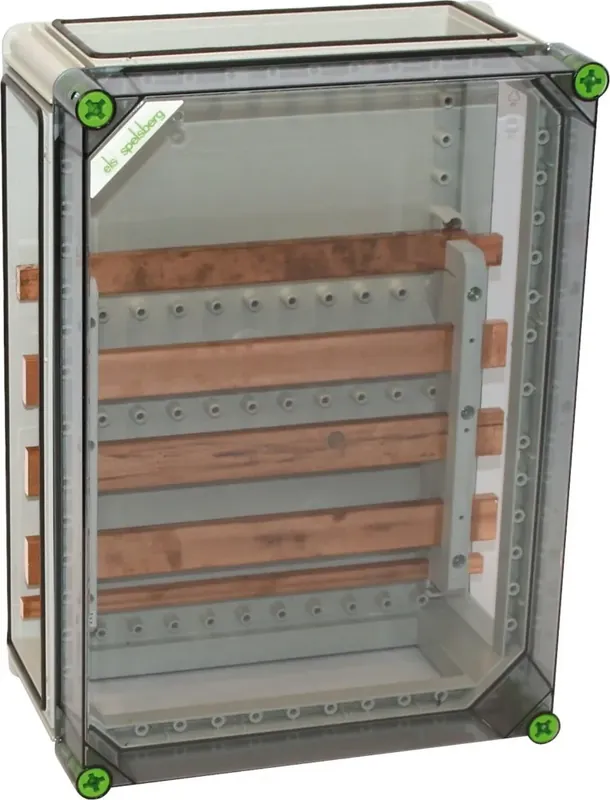 Sammelschienengehäuse mit zusätzlichem Anschlussraum, Sammelschienensystem, 5-polig, ohne Klemmen, zur individuellen Bestückung, mit transparentem Deckel, 3 x Gehäuseverbinder (GGV), mit Sammelschienensystem 5-polig 630A, mit CU-Schienen, L1…L3: 30 x 10mm, N: 25 x 10mm, PE: 12 x 10mmAbmessungen: 320 x 440 x 179mm