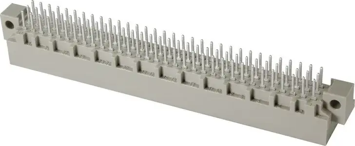 Messerleiste, Wellenlötanschluss, Bemessungsstrom: 2 A, Kontakte: 64, gerade, Kupferlegierung, Edelmetall über Ni steckseitig, Sn über Ni anschlussseitig, Anforderungsstufe: 2, nach IEC 60603-2, Kodierung: Kodierung mit Kontaktverlust, Leiterplattenbefestigung: mit Flansch, Thermoplastischer Formstoff, glasfaserverstärkt, RAL 7032 (kieselgrau)
