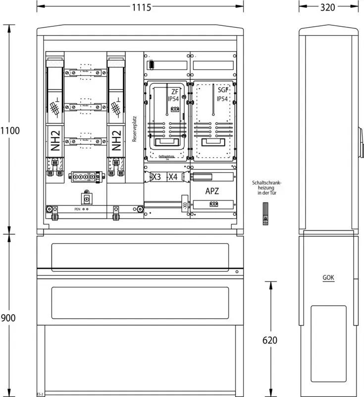 Wandlermessung WM-ZP-250/400A-SGF 2142-0432.63, – Gehäuse Größe 2 / A120-1100 RAL 7035, – Schutzart IP44 / Schutzklasse II, – inkl. Eingrabsockel mit Kabelabfangschiene, – Material: glasfaserverstärktes Polyester, – mit Doppelschließung für Profilhalbzylinder 40 oder 45mm, -Einbauten: – 1x Anschluss über Sicherungslastschaltleiste NH2 mit V-Klemme 35 bis 240mm² (VNB Bereich), – 1 Satz Wandlerlaschen 30x10mm gemäß DIN 42600 Teil 2, Form A, – 1x Anschluss über Sicherungslastschaltleiste NH2 mit V-Klemme 35 bis 240mm² (Kundenteil), – 1x Reserveplatz im Abgangsbereich, – 1x Zählerplatz IP54 nach DIN 43 870 mit Klappfenster, – 1x Steuergerätefeld IP54 nach DIN 43 870, – 1x Spannungspfadsicherung D01/3polig, 1x Steuersicherung-D01/1pol. 10A für SGF mit Plombierhaube, – Zählerprüfklemmleiste, – 1x Abschlusspunkt Zählerplatz (APZ), – Buchsenstecker für die Spannungsversorgung, – 1x RJ45 Buchse, – 1x Schaltschrankheizung mit Temperaturregler und Sicherung D01/1polig, optionale Erweiterungen Zubehör: – Sonderlackierung, – Überspannungsschutzeinrichtung, – Sockelfüller