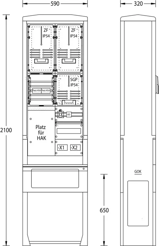 Zähleranschlusssäule ZAS-S-2-SGF AVACON 2131-0523.45, – Säule Größe 0 / A070-2100 RAL 7035, – Schutzart IP44 / Schutzklasse II, – inkl. angepresstem Eingrabsockel mit Kabelabfangschiene, – Material: glasfaserverstärktes Polyester, – mit Doppelschließung für Profilhalbzylinder 40 oder 45mm, Einbauten: – 1x Platz für Hausanschlusskasten-1x3NH00, -2xHS 63 A 3 pol., – 2x Platz für selektiven Hauptsicherungsautomat auf Sammelschienensystem 5pol./12x5mm Cu, – 2x Zählerplatz IP54 nach DIN 43 870, – 1x Steuergerätefeld IP54 nach DIN 43 870, – 1x Steuersicherung-D01/1pol. 10A und Steuerklemme für SGF mit Plombierhaube, – 2x Abgang mit Hauptleiterabzweigklemme 1,5-25mm² 5pol., – 1x Verteilerfeld mit 1x12TE (unbestückt), optionale Erweiterungen siehe Zubehör: – Sonderlackierung, – Hausanschlusskasten NH00, – selektive Hauptsicherungsautomaten, – Überspannungsschutzeinrichtung, – Sockelfüller